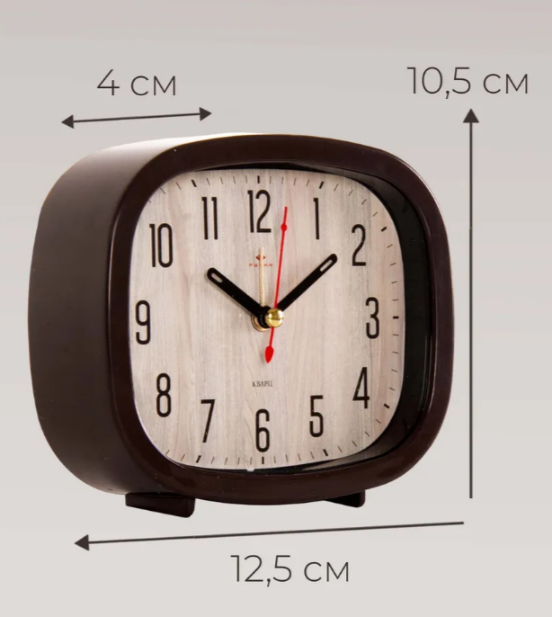 Прямоугольные часы с классическим дизайном станут универсальным решением для вашего дома или офиса. Этот стильный аксессуар создаёт гармонию в любом пространстве. Благодаря компактным размерам модель можно разместить на столе, тумбочке, полке или стеллаже. Громкий сигнал делает будильник надёжным помощником, который поможет проснуться во время. Контрастные стрелки и чёткий циферблат обеспечивают хорошую видимость даже на расстоянии. Часовой механизм работает от батарейки АА (в комплект не входит). Эти небольшие часы можно использовать в разных помещениях: поставить в спальне, на кухне или украсить ими рабочий кабинет. В гостиной или зале они станут стильным акцентом и подчеркнут индивидуальность обстановки. Универсальное решение, которое легко впишется в различные стили интерьера: от минимализма до лофта. Модель может использоваться как самостоятельный элемент декора. Часы отлично подойдут для подарка близким: их оценят подростки, студенты и школьники. Это идеальный выбор для тех, кто ценит уют, аккуратные и стильные детали в интерьере. Часовой механизм имеет дискретный ход. Размер часов - 12,5х10,5х3,8 см. Размер циферблата - 10,4х8,5 см. Произведено в России, проходит ОТК.