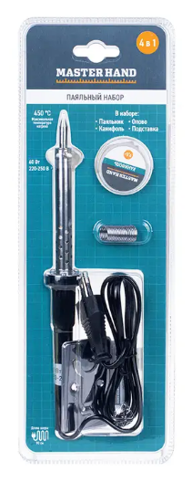 Паяльный набор, Master Hand, подойдёт как для начинающих, так и для опытных мастеров! Пригодится для ремонта электрических приборов, работы с микросхемами и пайки различных металлов. В наборе паяльник, олово, канифоль и подставка. Перед использованием ознакомьтесь с руководством по эксплуатации внутри упаковки.