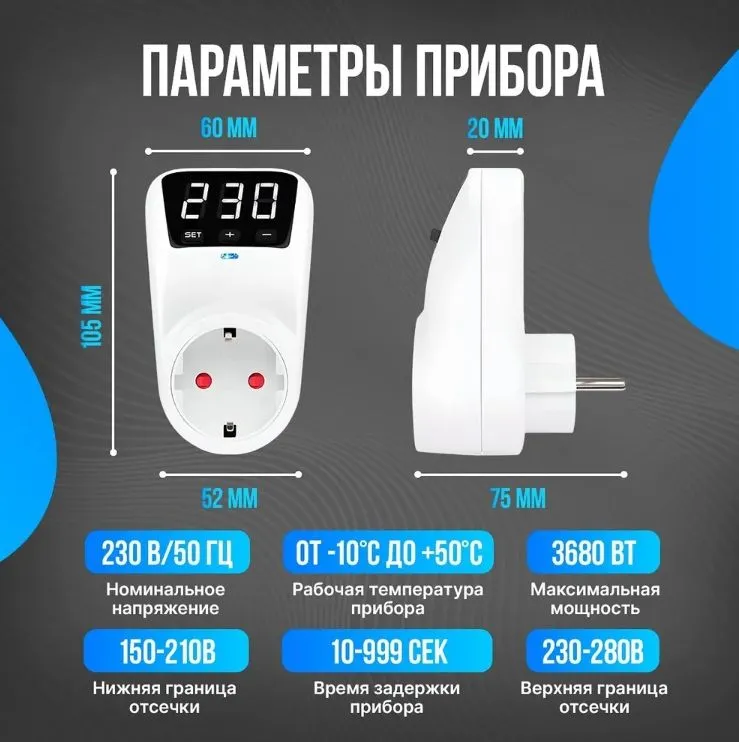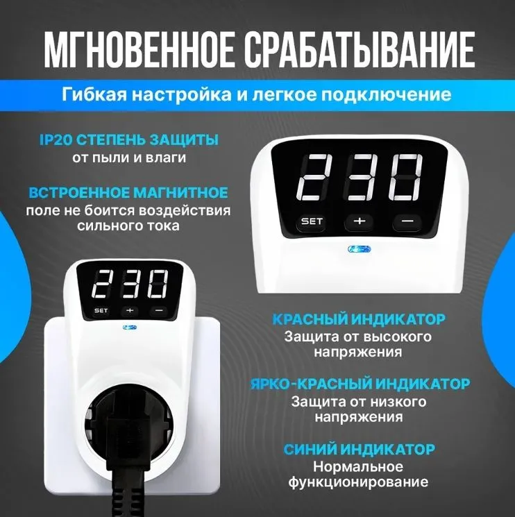 Благодаря встроенным технологиям, реле эффективно фильтрует сетевые помехи и защищает от высоковольтных импульсов, что особенно важно для сохранения работоспособности дорогостоящей техники. Помимо этого, устройство автоматически отключает питание при обнаружении аномальных скачков напряжения, создавая дополнительную защиту от повреждений. Простой и интуитивный интерфейс позволяет легко настроить параметры работы реле, обеспечивая оптимальные условия для работы ваших электроприборов.