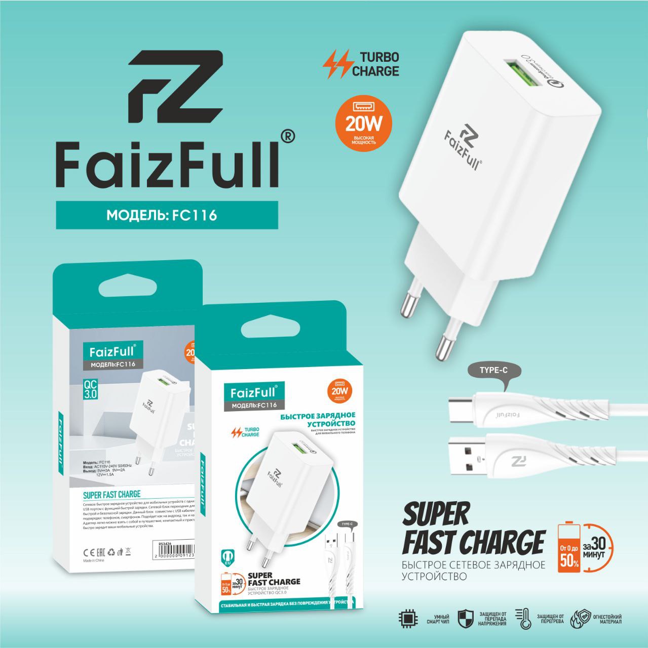 Сетевое зарядное устройство с кабелем Type-C 1-метр 3А QC3.0 20W FaizFull FC116
