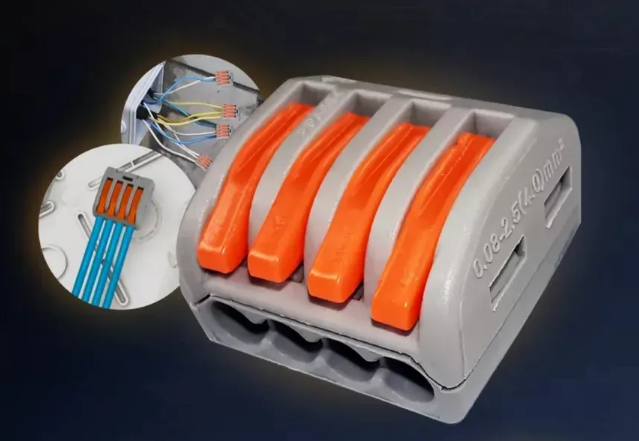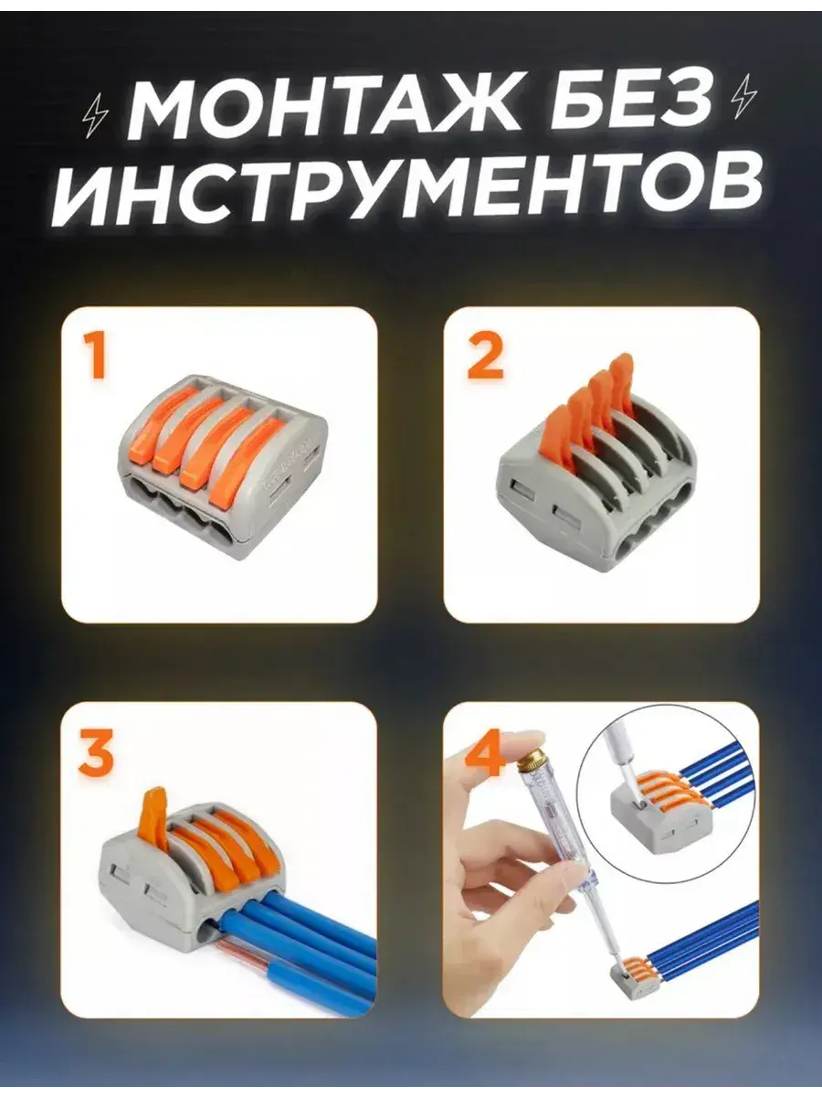 Универсальные клеммники 4-х проводные соединяют два электрических кабеля с зажимами аналог Wago.