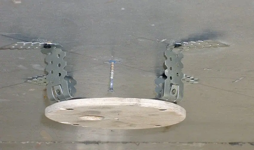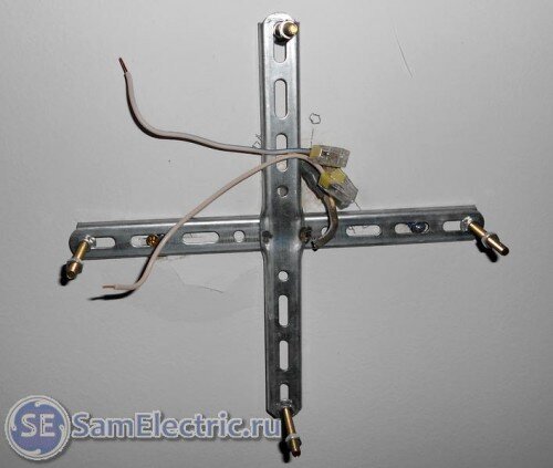 - Закрепить кронштейн к базовым направляющим с помощью саморезов или анкерных болтов. Для этого нужно выбрать наиболее удалённые от проводки точки и закрепить кронштейн по центру относительно вывода электропроводки.